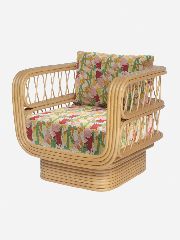 This rattan lounge chair features a deep seat, armrests and floral fabric cushions. There is a Californian air about this chair that speaks to lazy, sunny days and is just delightful.