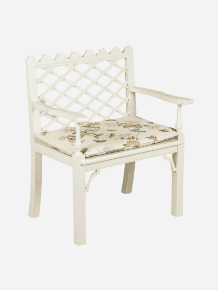 A whimsical and playful design, this Sibyl Colefax & John Fowler piece would look wonderful facing a sofa, or in the corner of a bedroom. It would also work well in an orangery, among artfully displayed greenery. The chair is based on a 1950s Colefax & Fowler design.