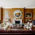 Walking from the hall, through a vivid yellow corridor, you reach the quieter tones of the kitchen, where the family also likes to congregate. It was previously the Victorian ballroom and now has a dining area at one end and a seating area at the other, with a vast central kitchen island and units designed by Plain English. This room was the owner’s project and, after its dark panelling had been removed, neutral colours were chosen to create a calm backdrop for works by Gillian Ayres and David Spiller, as well as a couple of her own oil paintings. ‘This is a great room for parties – we’ve had 70 people sitting down in here,’ she says. Much smaller dinners take place in the dining room, where aubergine walls and polished mahogany table are lightened by Ashley’s gilded console tables and pictures of Popeye and Olive Oyl.