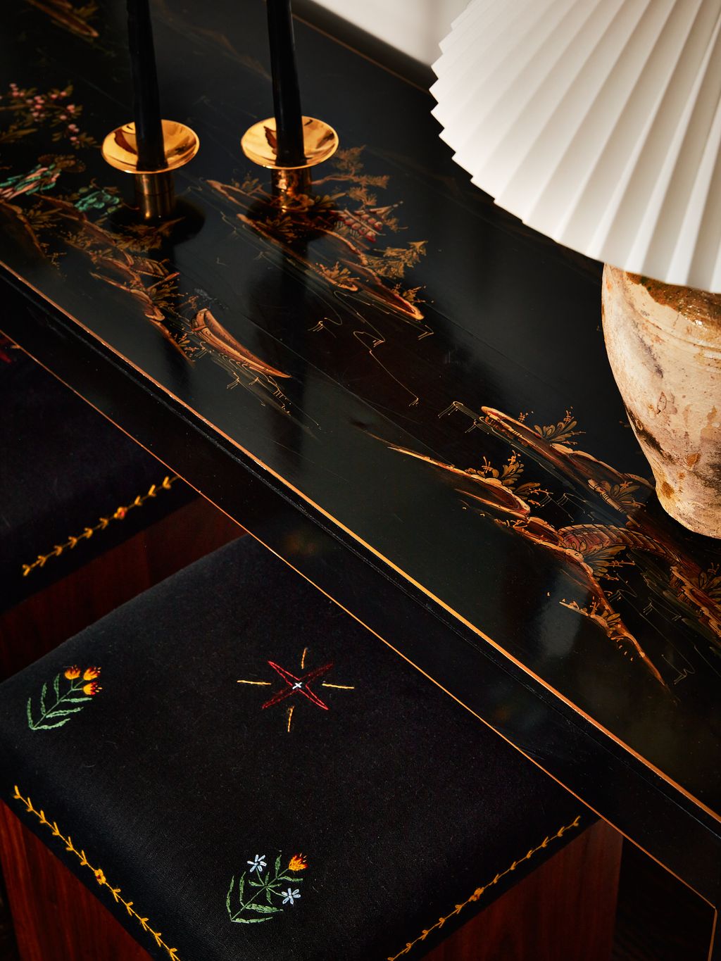 The scheme was by no means limited to vintage finds, and Augusta commissioned Brooklyn furniture designers Green River Project to create a pair of ottomans to fit under the vintage chinoiserie console. They are upholstered in black linen and embroidered by designer Emily Bode, inspired by the wall sconces in the living room. “I wanted to make sure every room felt distinct, but also that they flowed well together,” Augusta explains. She added subtle repetitions to maintain consistency throughout the apartment. “I like to make a bridge between the spaces, for instance the same chair with different fabric in two different rooms.”