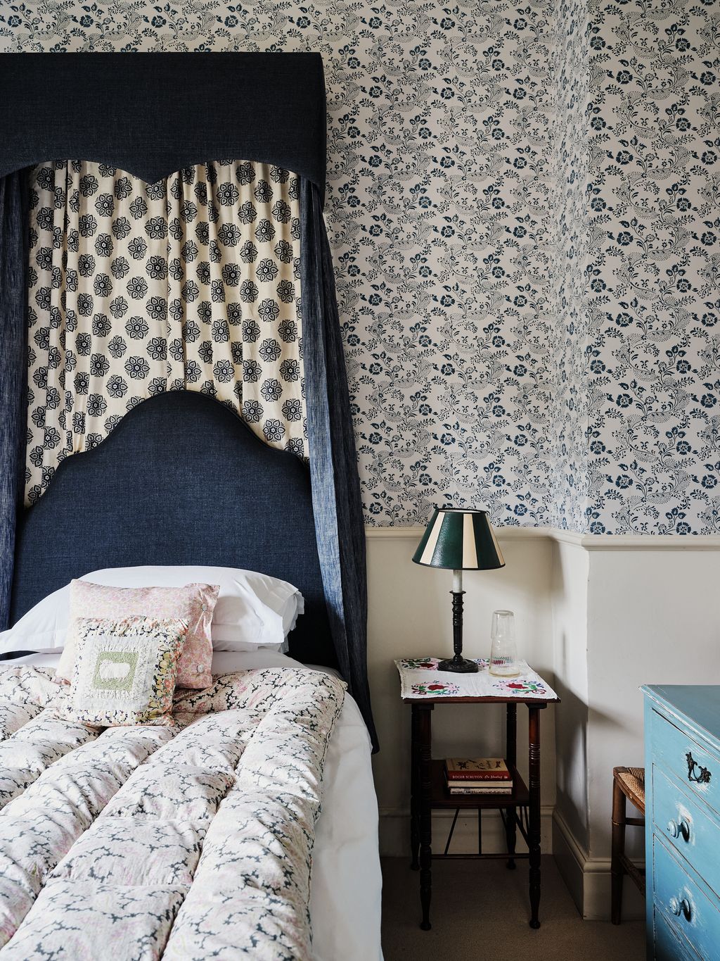 The house had been a labour of love for Hugo, carried out over two decades. Two big name decorators had already had a hand in its design before Blanche moved in. The late Robert Kime, a friend, assisted with the layout, furniture and lighting. Robert sourced the bed in the main bedroom, a copy of a Lutyens design, and the Moroccan lantern that hangs in the lightwell of the staircase. In the sitting room the sofa, ottoman and fabrics are all recognisably his.