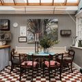 Once they were established in the house, Brita and Mick proceeded, as they put it, to fill it up, partly with their work and the things they acquired, and partly with children (they have four boys, all now grown-up). Their first priority was to establish a studio on the top floor from what had been two attic bedrooms, each with their own avocado hand basin. All that went, and the pair commissioned local joiners to line the walls with whitewashed timber boards in the style of an airy Swedish cabin. Unimpressed, the Geordie joiners told them the space looked like ‘an upturned boat,’ but this only made it all the more delightful to Brita and Mick, as they loved the upturned fishing boats used as cabins on the nearby island of Lindisfarne. Next they tackled the kitchen, which is anchored by a wonderful Formica island which they retrieved from a local school that was shutting down, eventually finding leftover Formica countertops in the same discontinued shade of ice blue. An old lean-to next to the kitchen was eventually transformed into a light-filled conservatory with red and white checkerboard floors, a deeply appealing space that, like so many other parts of the house, makes for a perfect studio.