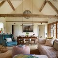 She had already worked on the main house, anyway, so she had a very good handle on what the clients wanted. “It only had capacity for the family,” says Caroline of the cart shed, so the plan was to turn the shed – an open-sided herringbone brick-and-flint structure with oak beams which had long been used as little more than coverage for cars – into guest quarters to accompany the main house. The space would be used, she says, by “a very broad range of people, so it had to be entirely flexible. Grandparents, as well as the clients’ friends, as well as overflow for children.” As such, Caroline needed to design an open, fairly neutral space for anyone to stay in, but one that was still homely and cottage-like. “They wanted it to be a very welcoming, cozy, familiar space that you can walk into, and feel immediately comfortable. That did obviously dictate the choice of fabrics and everything else.”