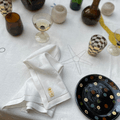 From ceramics derived from moulds used by the ancient Egyptians to hand-embroidered napkins featuring calligraphic stories found in the ancient tombs of Cairo, Cosmic Dreams promises more than just the twinkling stars that adorn the collection (though these are utterly charming). The collection is also imbued with a deep fascination with Egyptian mythology. “This collection has women in mind,” explains co-founder Goya, “particularly paying homage to an Egyptian goddess, Nut.” Nut, appropriately enough for Cosmic Dreams, was the Egyptian deity who ruled over the stars and the firmament, as well as an embodiment of motherhood; she is a savvy patron for Goya and Margarita to have chosen for their collection.