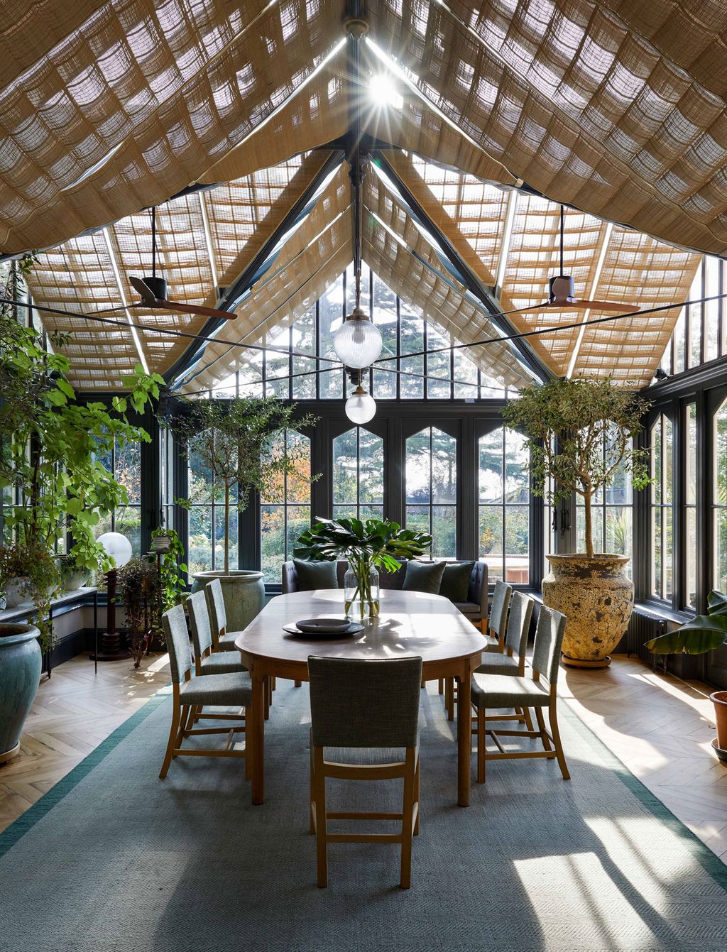 The house has a simple layout, with a long, half-panelled corridor running along its spine, lit by a row of ‘Ball’ lights by Michael Anastassiades. At the east end is the kitchen and dining conservatory; at the other is a stone-flagged hall, the restrained decoration of which is softened by two large fiddle-leaf fig trees, a textile-based artwork by Italian artist Carolina Mazzolari and a Mai Wellner flatweave rug. A huge bespoke mirror leaning against one wall adds an element of Alice in Wonderland fantasy, but the centrepiece is an antique Swedish Komsta-stone table: its polished grey limestone top is full of fossils and at least 5cm thick.