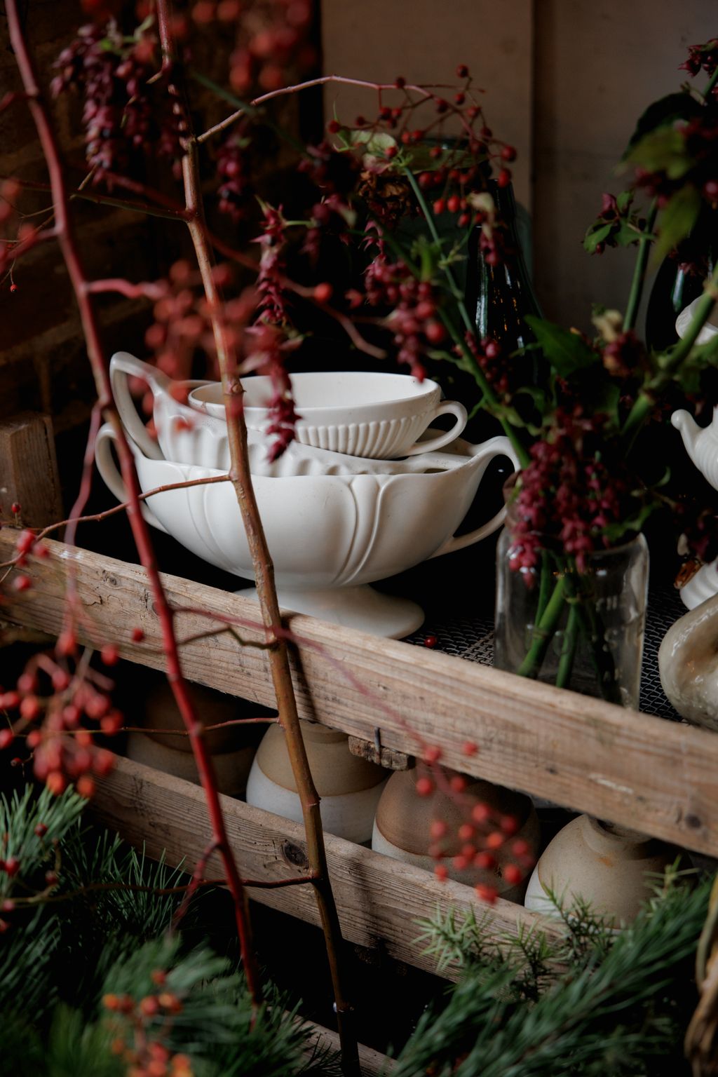 ‘I like to keep my Christmas decorations simple and accessible: it’s intuitive and nothing is over-worked or over-thought,’ continues Graeme. ‘It’s about elevating everyday ingredients. For instance, a sprig of something on the napkin is a lovely little gesture.’ These ingredients are woven together, adorned with lights or arranged in bud vases to make a series of low-cost but deeply effective decorations. Lengths of fir adorned with larch and fairy lights hang from wooden beams inside the house, while carefully placed branches of rosehips and a scattering of small bud vases holding just a few hardworking stems greet you at every turn.
