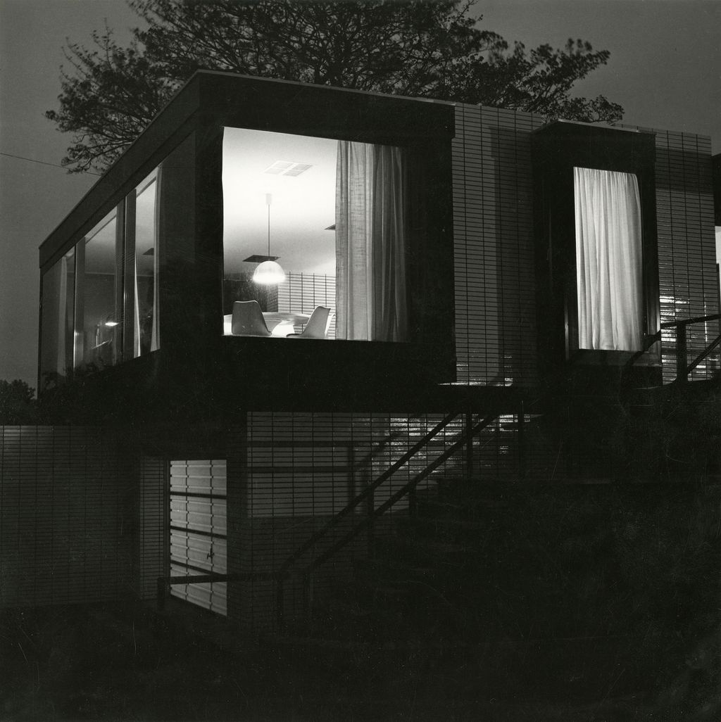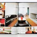 One of the most unusual features of the interior is the white ceramic tiled unit constructed of the same tiles which are used for the exterior walls This unit houses a 25-inch colour TV set and stereo record player, which can be made to disappear by remote control from a wall console, which also controls the curtains. A four-seater Bastiano sofa and chairs in black hide are set round an immense coffee-table top. This table is also a record cabinet. Lighting is by stainless steel table lamps for the storage unit and by a widely curving Flos lamp.