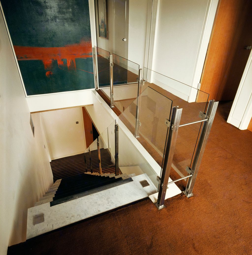 The two floors are linked by an open staircase with Sicilian white marble treads and stainless steel and plate glass balustrade.