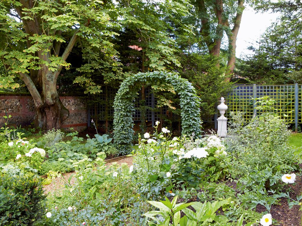 The walled garden, now such an important part of the property, was not ever thus. When the Wilsons bought the house, it was, says Sarah, 'all coal bunkers and outhouses'. Now, though, it is classic Carter. Approached through a gate from the gravelled courtyard, the broad terrace leads down shallow steps to a formal garden of lawn and box-edged beds, filled with clipped domes of George's favourite hebe, 'Pewter Dome'. The beds are bisected by a generous gravel path, which runs the length of the garden, from a painted baroque bench against one wall to an eyecatcher in the form of an urn on a plinth beyond a foliage arch at the other. Colours are quiet, and order and symmetry reign.