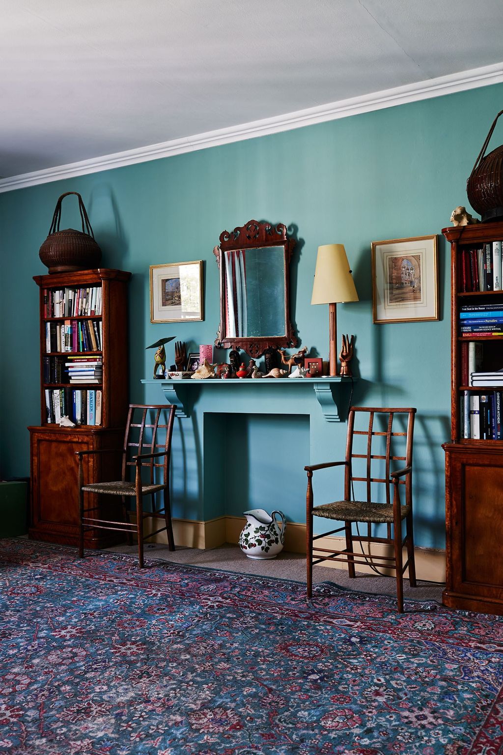 As you enter the house, the light-filled hall leads you towards the back door into the greenhouse and on towards the garden. A Robert Buhler landscape of France from the Forties hangs against a Nina Campbell wallpaper. On the left is David's library, with a chunky Victorian desk and a naive painting of a sailing boat by the Spanish artist Ramiro Fernández Saus above it; the double-handled vessels underneath are from Ardgowan Antiques. The desk stands on a modern rug designed by Linda - inspired by Paul Klee and Navajo tribal rugs.