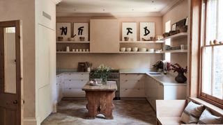 Jessica and her client knew they wanted a pink kitchen from the outset. The colour was created on site by a paint specialist, drawing out tones from the reclaimed terracotta floor. ‘He and I stood together and gradually built up the colour,’ says Jessica. ‘It has so much more depth and life than traditional flat paint.’ The kitchen itself is pared back, with an antique butcher’s block from Gallery BR in Tetbury and a pine bench from The New Craftsmen.