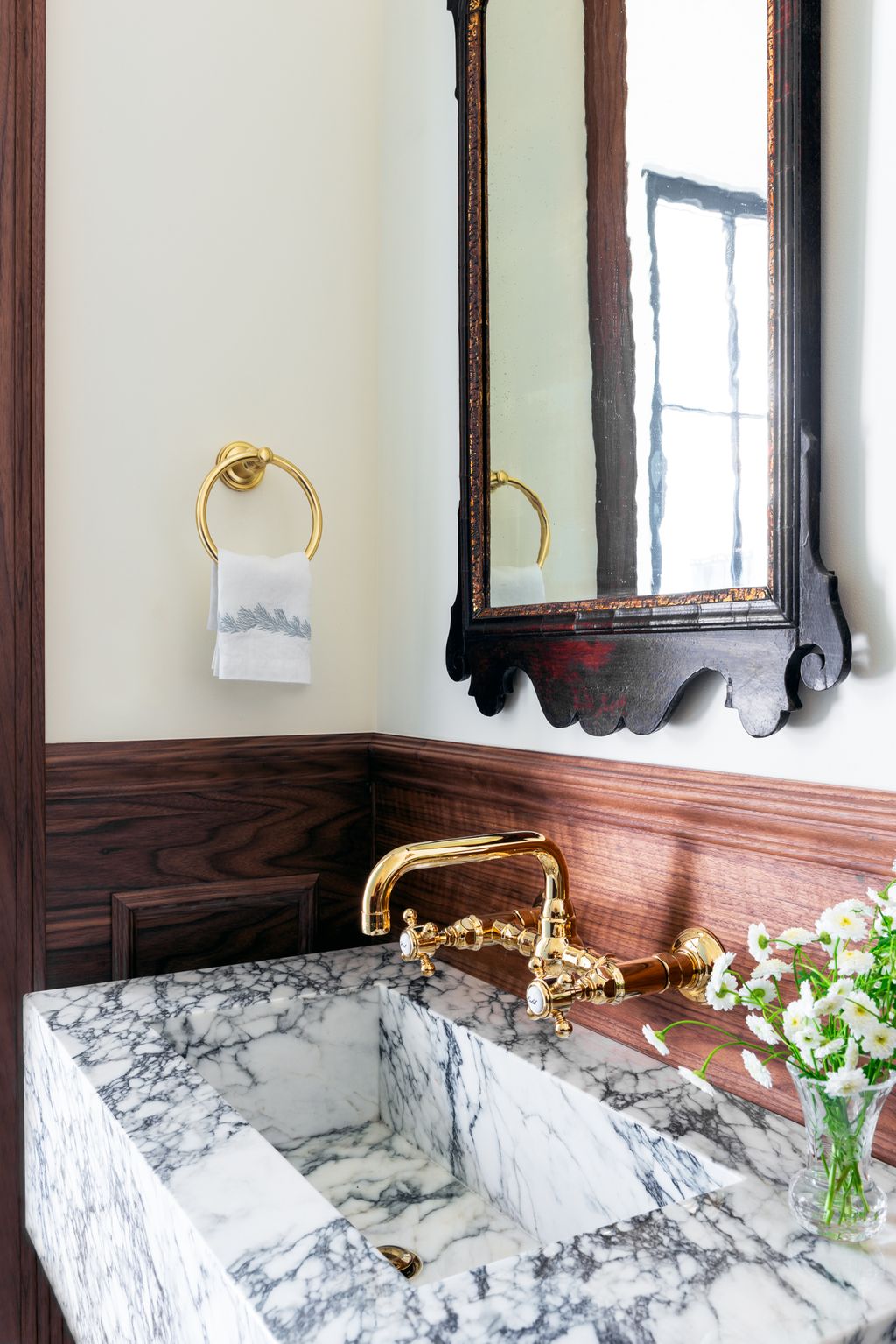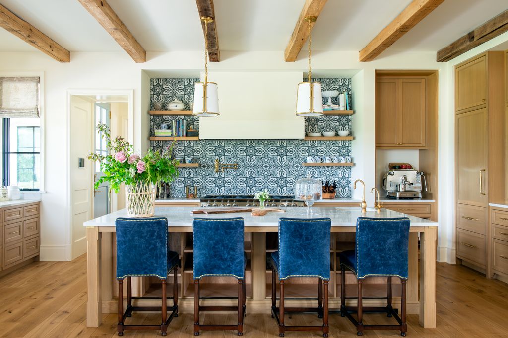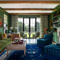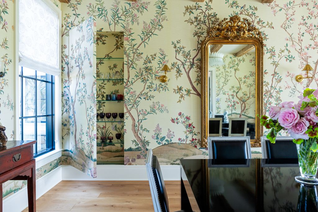 The interior design involved leaning into British style: wallpapers, rich colours, flowers, natural hues, antiques and special pieces from the clients' travels. "Our goal was to ensure that all materials and architectural details took priority over the choice of furniture and fabrics, to allow for proper coordination," says Lauren Lozano Ziol, designer at Skin Interior, who continues, "my favourite room is the dining room; IKSEL's floral wallpaper lends a magical element to the home and creates an intimate space in which to dine. The wallpaper adjacent to the white chandelier with murano glass feathers creates a unique ambiance in the house. The recessed bar serves as a treasure chest to display the client's collection of vintage items."