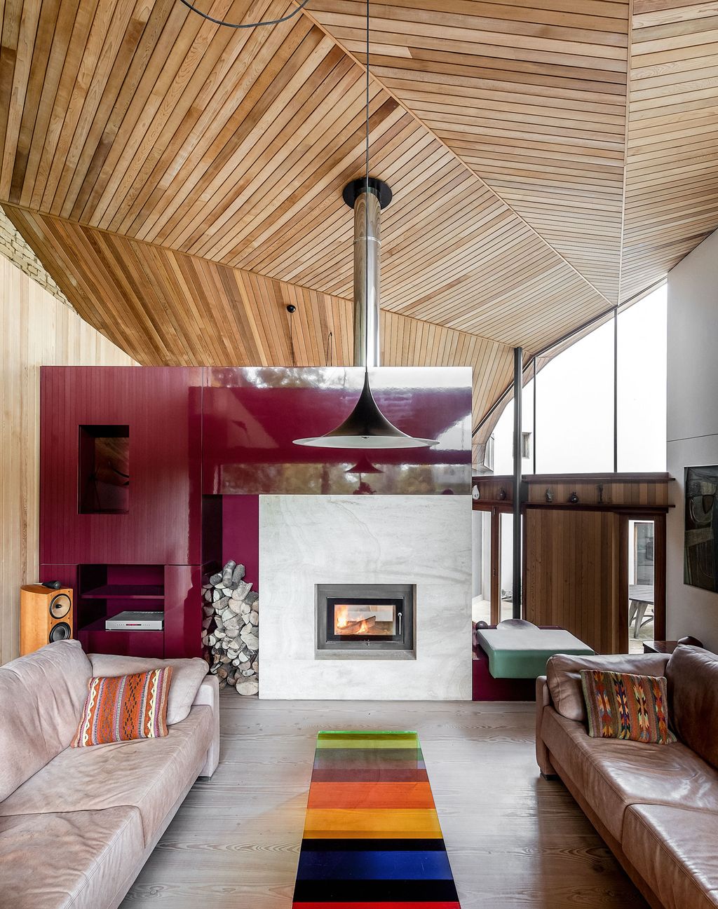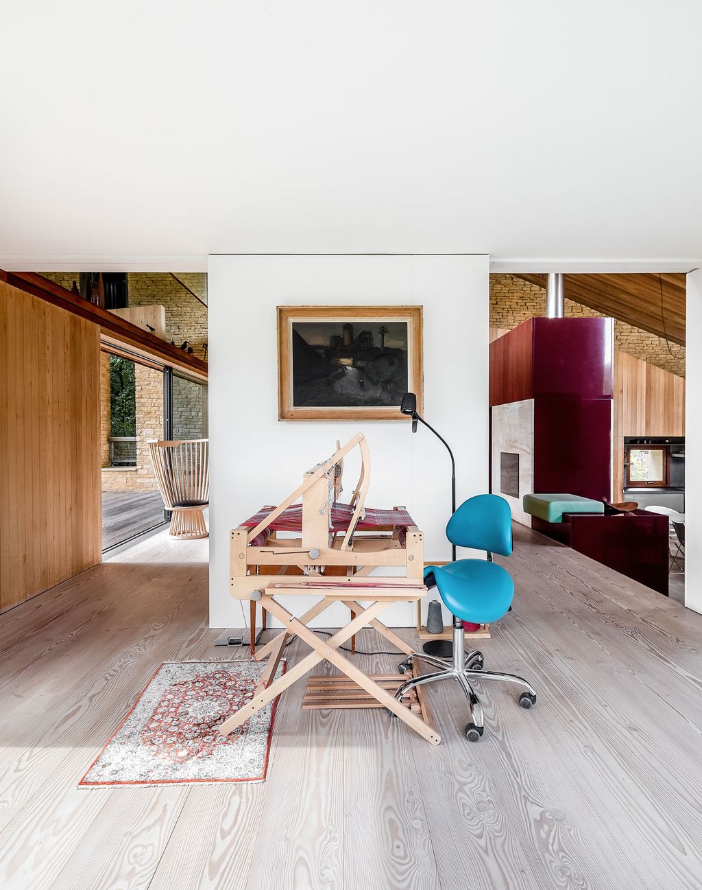 Entering the house, you go through a small hallway and up stairs before coming into the kitchen. Here a dramatically faceted cedar-panelled ceiling follows the line of the roof and rises to a double-height space, which encompasses the sitting room and a music and weaving room, then a study. Although the building is essentially open plan, Sarah’s design has ensured there are these separate areas, thanks to cleverly placed pocket doors. Nicky’s loom weaving is a pastime that only presented itself once the house was built. Finally, at the highest level, a small green-themed eyrie was created in response to the Lytteltons’ love of trees, which are showcased by the windows up there.