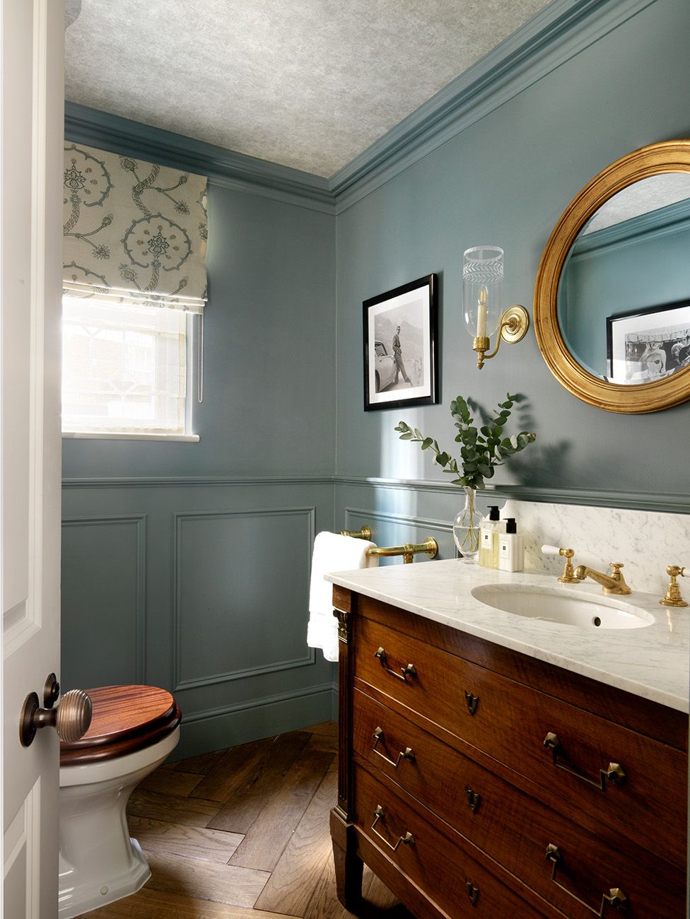 Upstairs, the space provided further challenges, though the layout of the rooms remained the same. Much of the furniture was custom-made to fit the rooms, including a bed with a broad, tall headboard in the master bedroom which had to be dismantled and rebuilt in the room. Likewise, says Emma, “getting the bath up the stairs was quite challenging!” Elsewhere, Emma and Kelly sourced antique pieces to complement the custom furniture, including from Brownrigg in Tetbury. “There's a beautiful commode [in the bedroom] that they're using as a chest of drawers,” says Emma by way of an example. “They love the balance and the layering of the antiques with the new.” As for the bathroom, the clients “loved a hotel bathroom,” says Kelly, and were keen to have a space that felt special to use – almost like a trip away. “Like it’s a bit of a treat and a bit of a luxury to stay there,” she adds. “All these details, they loved.”