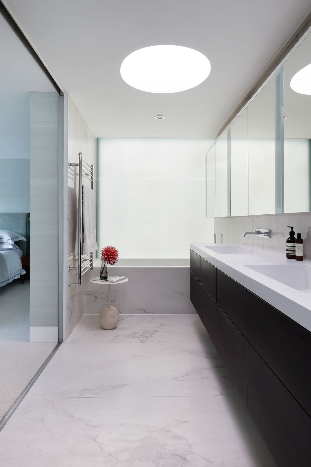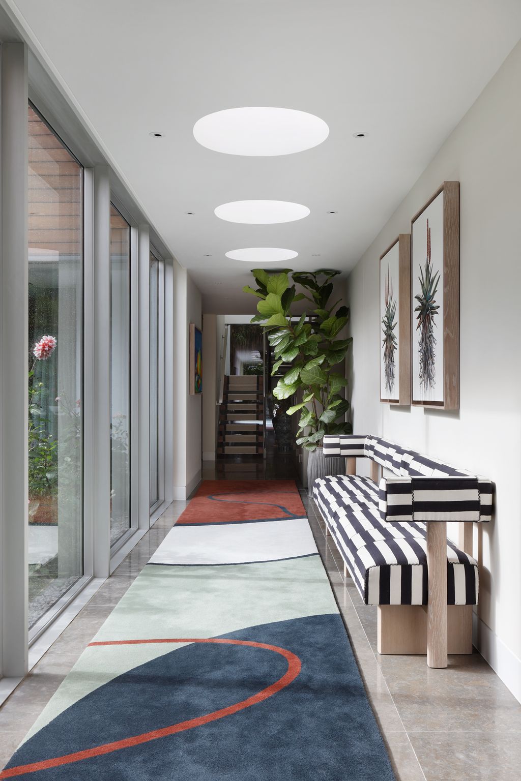 The two-storey house is long and linear with a double-height, sky-lit corridor running along one side. Opening off this are the living areas on the ground floor and bedrooms on the first. ‘The house was in great shape and much of what was there was good quality,’ Sophie says. ‘And I’m not one for ripping stuff out for the sake of it.’ That meant the existing kitchen units remained in place, although they have been updated with new granite work surfaces. Likewise, there was a perfectly decent stone floor throughout the lower storey. Instead of replacing it, Sophie chose to commission a series of vast runners and rugs by Deirdre Dyson, all in the same design, which add an instant element of aesthetic warmth to the ground-floor rooms.
