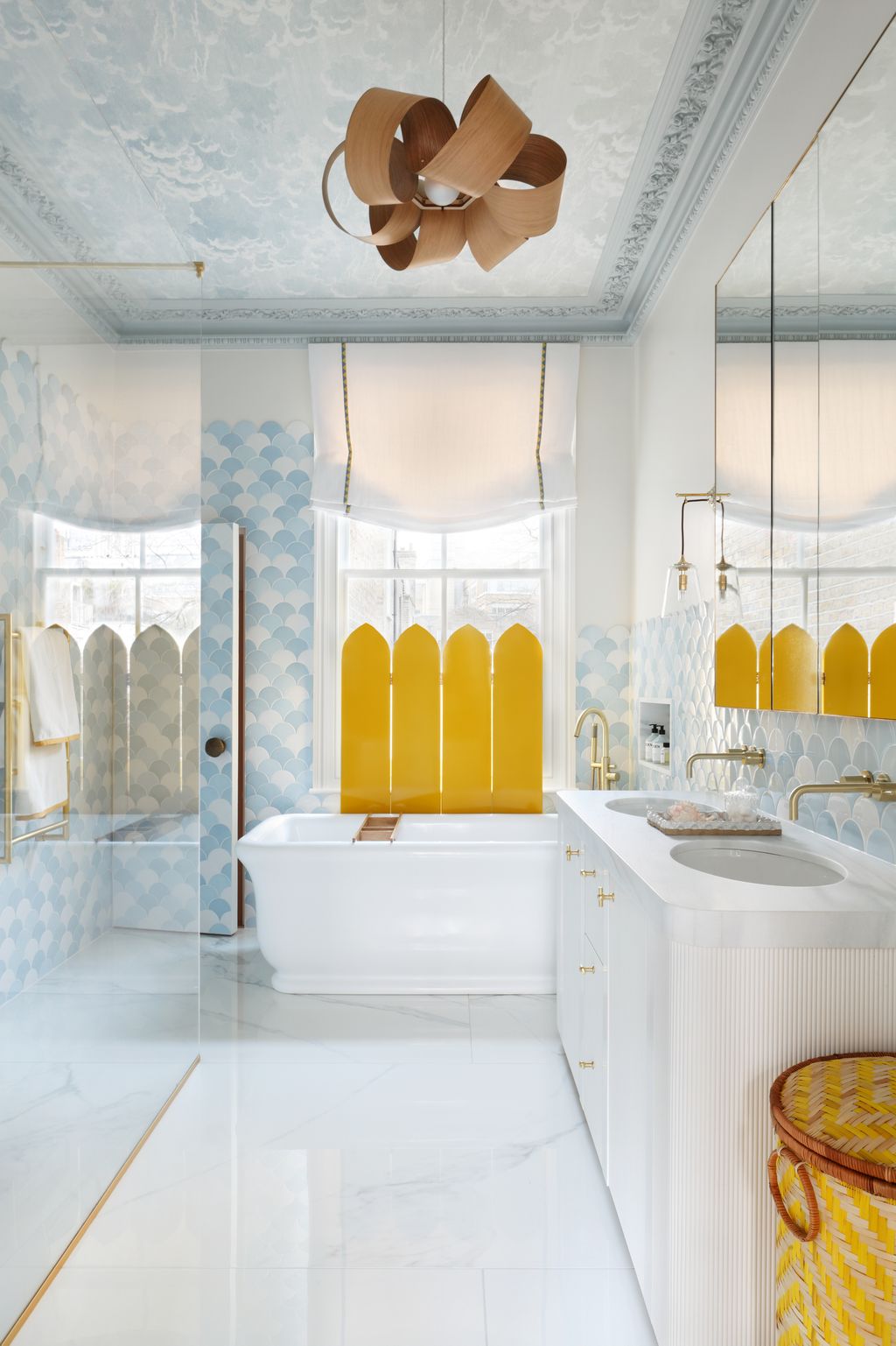 The Japanese influence makes another appearance on the lower ground floor, with a staircase enclosed by a slatted wooden screen. Pine beams run along the length of the ceilings, giving structure to the space, and a mosaic of geometric green, yellow and white floor tiles from the Mosaic Factory runs all the way through. ‘It gives it flow from front to back,’ says Sarah. The combination of natural materials with brass kitchen fittings and high-gloss lacquer cabinets brings a modern feel to the room. ‘The owners and I had a clear vision of how we wanted the house to look from the start,’ recalls Sarah. ‘It was really satisfying to see all the rooms coming together almost exactly as I had pictured them.’