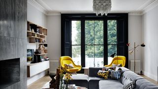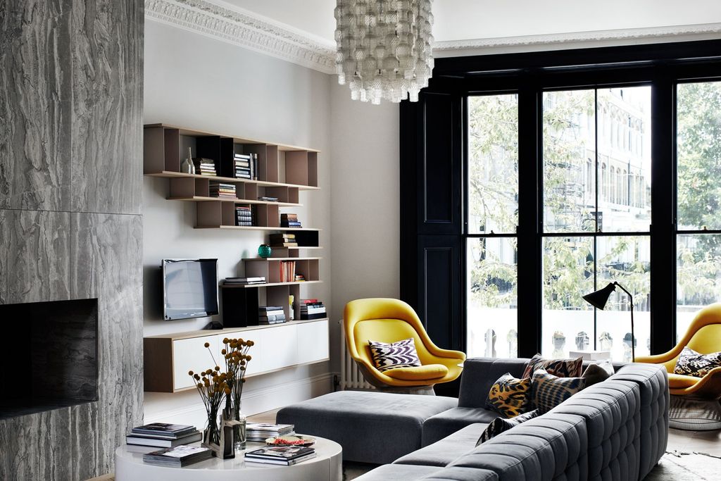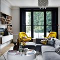 Upstairs, the first-floor sitting room might fit the description of more 'reined-in' were it not for the eye- popping yellow Warren Platner chairs and the huge marble chimneypiece that replaced a rather dated Nineties one. 'I wanted to give some shape and scale to the very large rect-angular room, but also to keep it simple and modernist,' explains Suzy, who added to the monumental scale with a fabulous Seguso Vetri d'Arte Seventies chandelier bought in Milan. Other Seventies touches include the low, lacquered, off-white coffee table that Suzy bought from Caira Mandaglio.