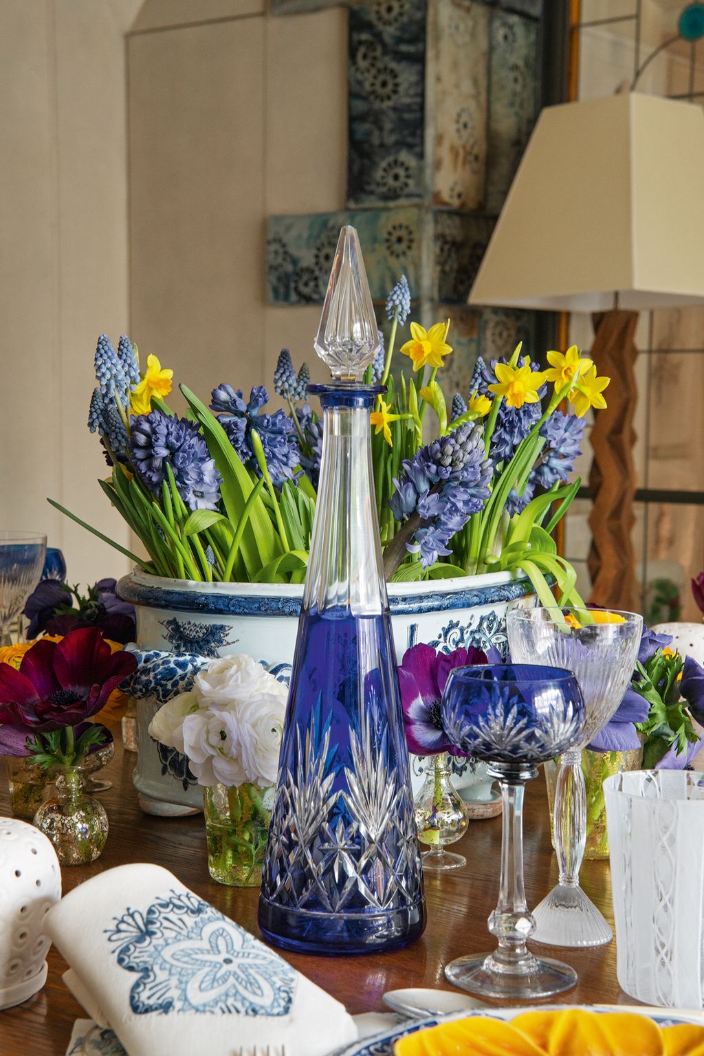 Always on the move between Paris, London, and New York, this make up pioneer and founder of By Terry has a disconcerting ability to entertain with effortless ease and a sure touch, creating a mood that is warm and welcoming. Whether the occasion is a professional dinner for two hundred guests or a dîner à deux with her husband, she instinctively creates a setting that is elegant but never too studied or contrived. Cheerful and colorful, scattered with posies of flowers or herbs, or sometimes hand-painted ceramic fruits and vegetables, her table decorations are invariably quirky and unconventional. She will marry delicate tablecloths and precious eighteenth-century plates with “affordable glasses and candlesticks found in a clearance sale,” but dislikes and would never allow “novelty cutlery, even on an Indian boutis, plastic, or napkins that are too small.”
