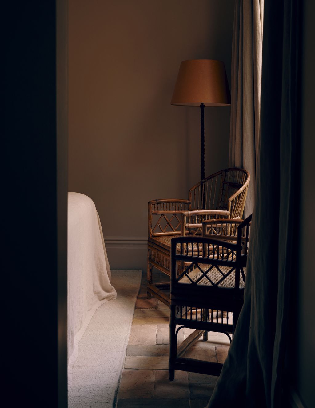 This sense of coolness and restraint is also a result of the tranquil and warm palette, which has become a signature style for Thea, who honed her eye while working at Rose Uniacke for five years. The hallway and kitchen walls are painted in the same colour as the kitchen cabinetry, while the main bedroom is in Edward Bulmer Natural Paint’s ‘Lilac Pink’. This room is a particularly peaceful hideaway, with the bed positioned so it looks out over nearby Queen’s Park. Textiles were key to creating a calm atmosphere – from curtains in Rose Uniacke’s ‘Sheer Linen’ to others made from inexpensive artists’ canvas. ‘It is a large house, so we had to be mindful about where to spend the money, and the clients were thankfully very open to fabric that cost £6 a metre from Goldhawk Road,’ explains Thea.
