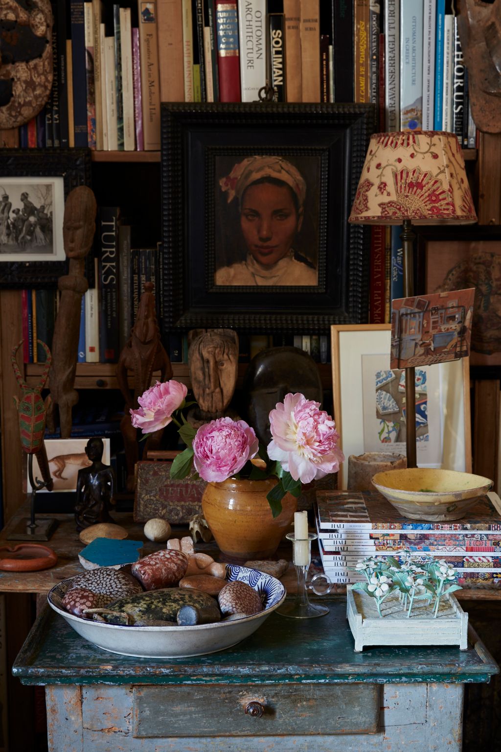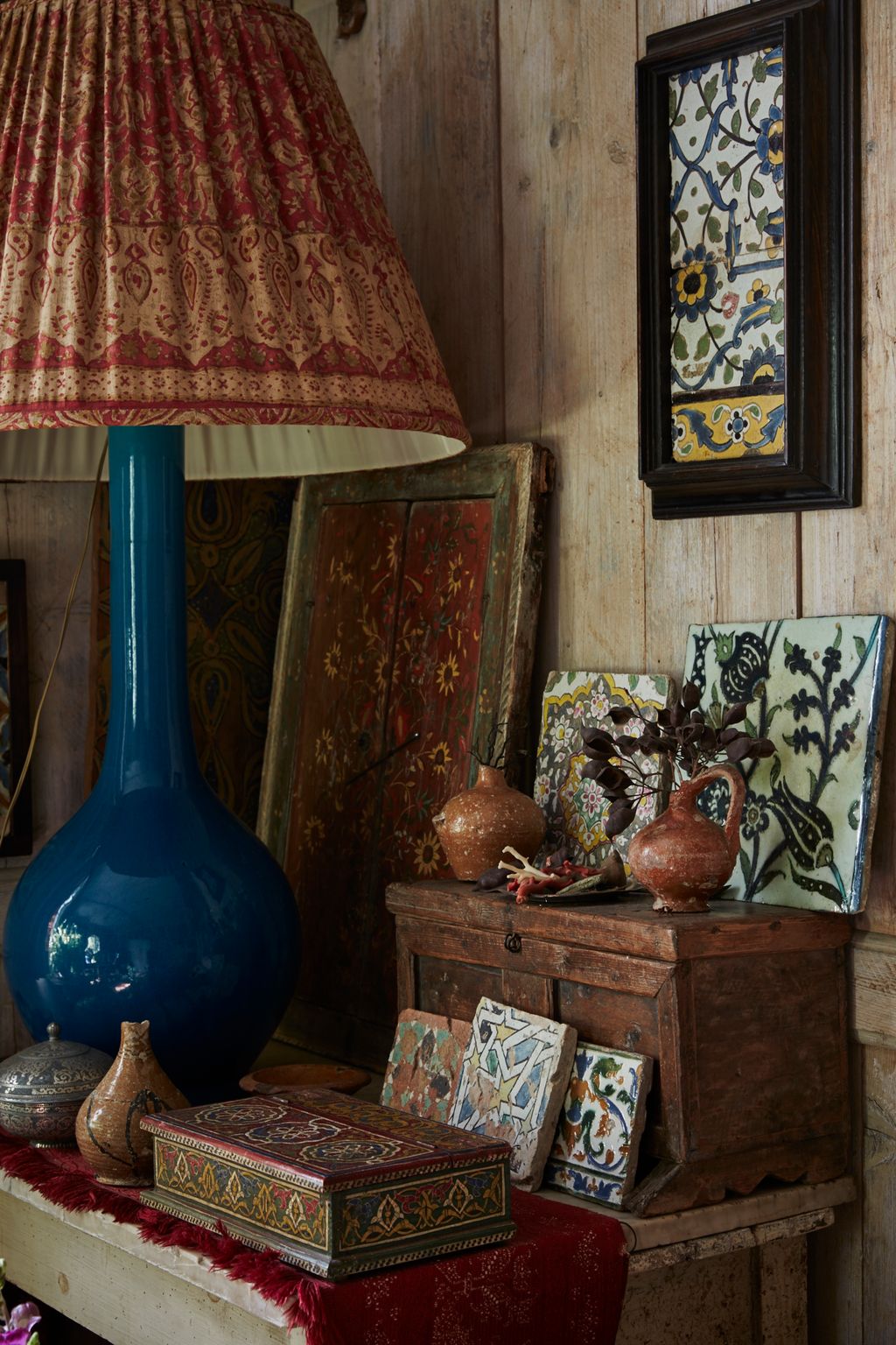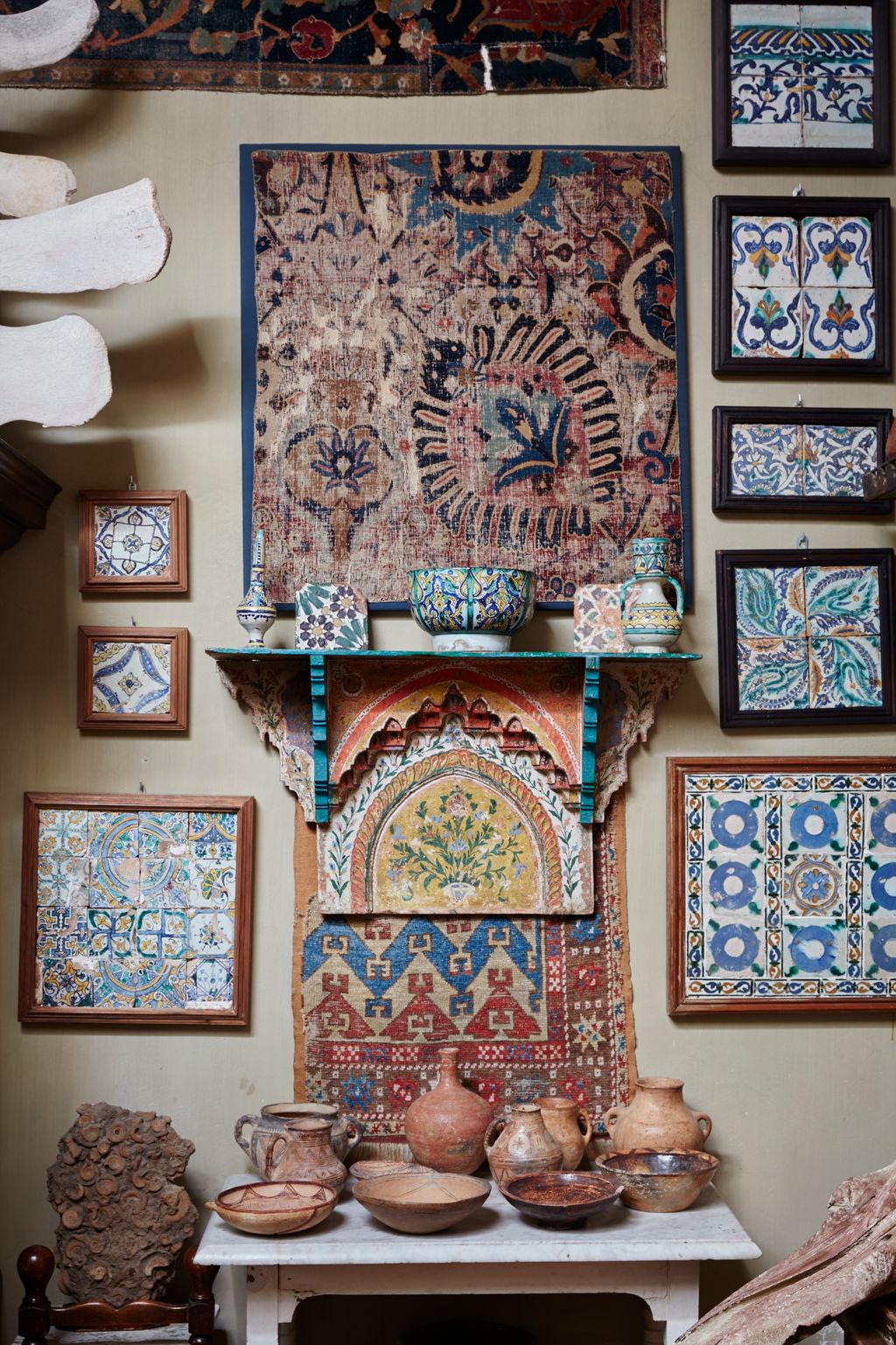 The toys have also found their way into Umberto’s eclectic displays of artefacts. His three homes – an apartment in Milan and his houses in Morocco – are filled with intriguing objects: Neolithic pottery fragments, Islamic tiles, antique textiles, Berber pots, Moroccan furniture and much more besides, making each room a cabinet of e curiosities. ‘I’ve always been a collector,’ says Umberto, whose collections are formed mainly of what he refers to as ‘neglected things’. ‘I want to preserve these unloved fragments for future generations. ‘I like to put the things I love together – a Greek sculpture next to an English sofa, next to a Moroccan table, next to whatever. It works because you love those things, and you love them because they have a beautiful shape or interesting story.’