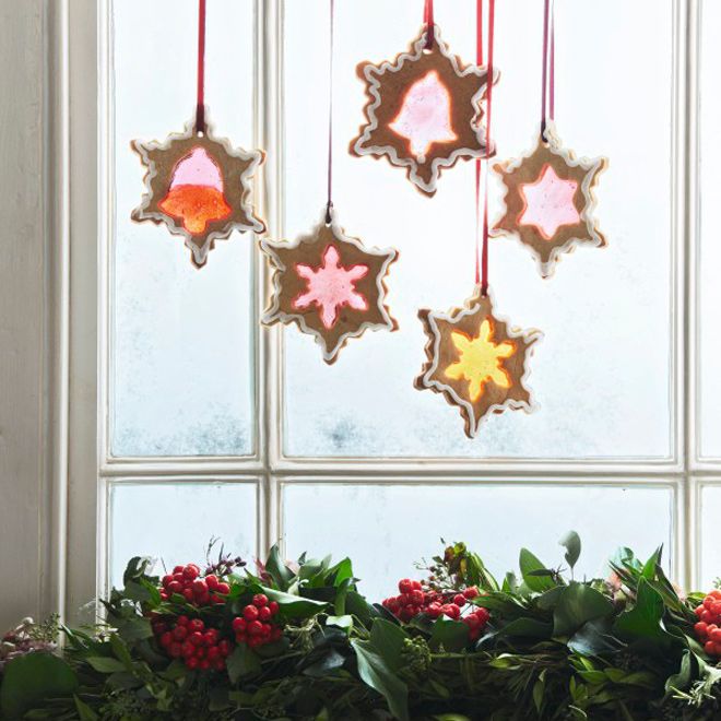Make a hole at the top of each of these Christmas biscuits so they can be hung on the Christmas tree (or in windows) with ribbon.