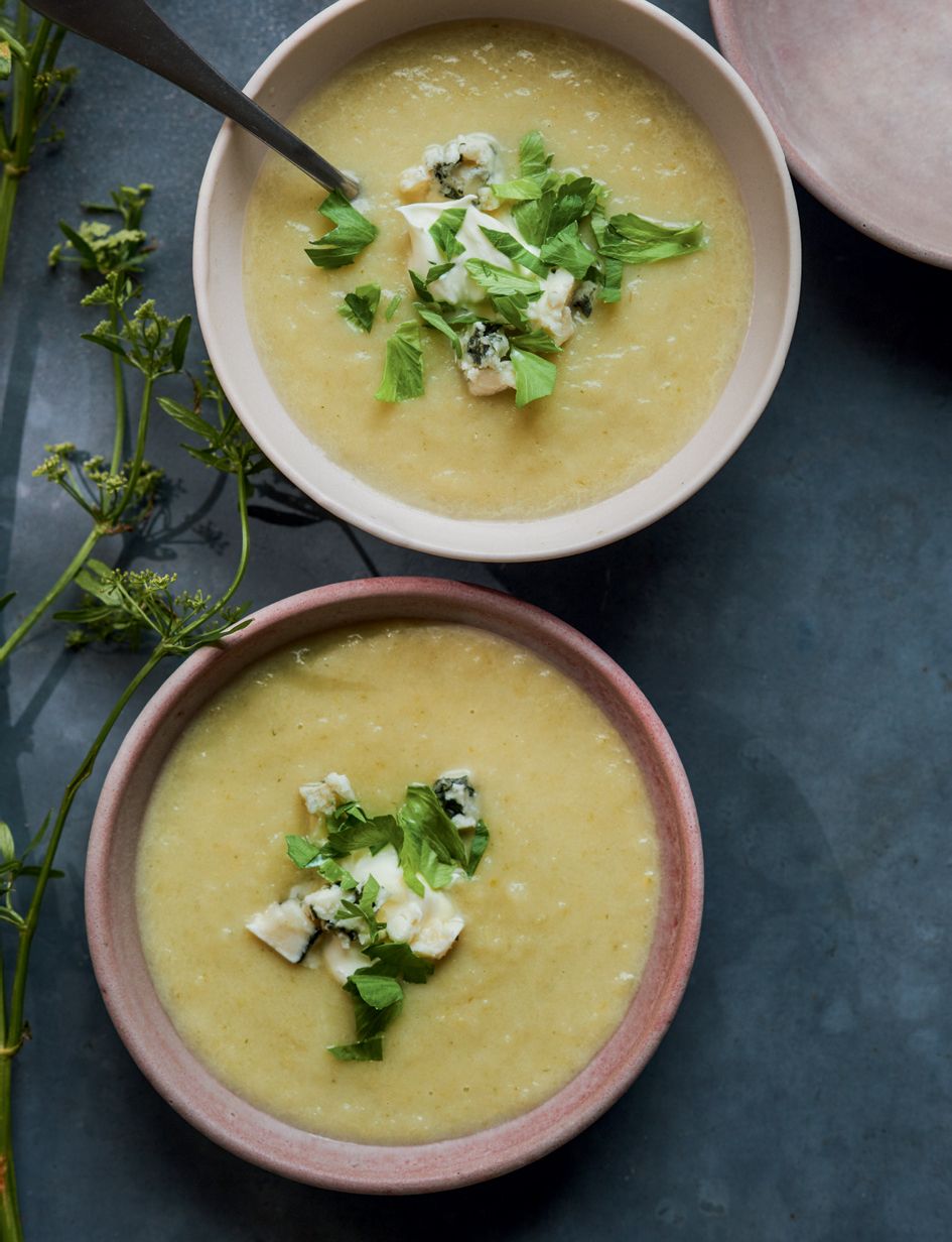 Tarragon’s moment of glory has to be a béarnaise sauce, so I forever think of the French as having laid claim to its allure. Certainly, it is an underused herb, but it can be quite assertive if included uncooked in a dish, when a single leaf can be the difference between subtle and overwhelming. I like it best when it is cooked, which calms its temperament, and it is rarely better than in the company of a little butter. Lovage could potentially replace the celery leaves in this recipe and, again, a little goes a long way. This soup lies in the Vichyssoise genre, so is just as good cold. If serving chilled, replace the crème fraîche with soured cream and omit the cheese. It would go beautifully with a spoonful of crabmeat in the centre.