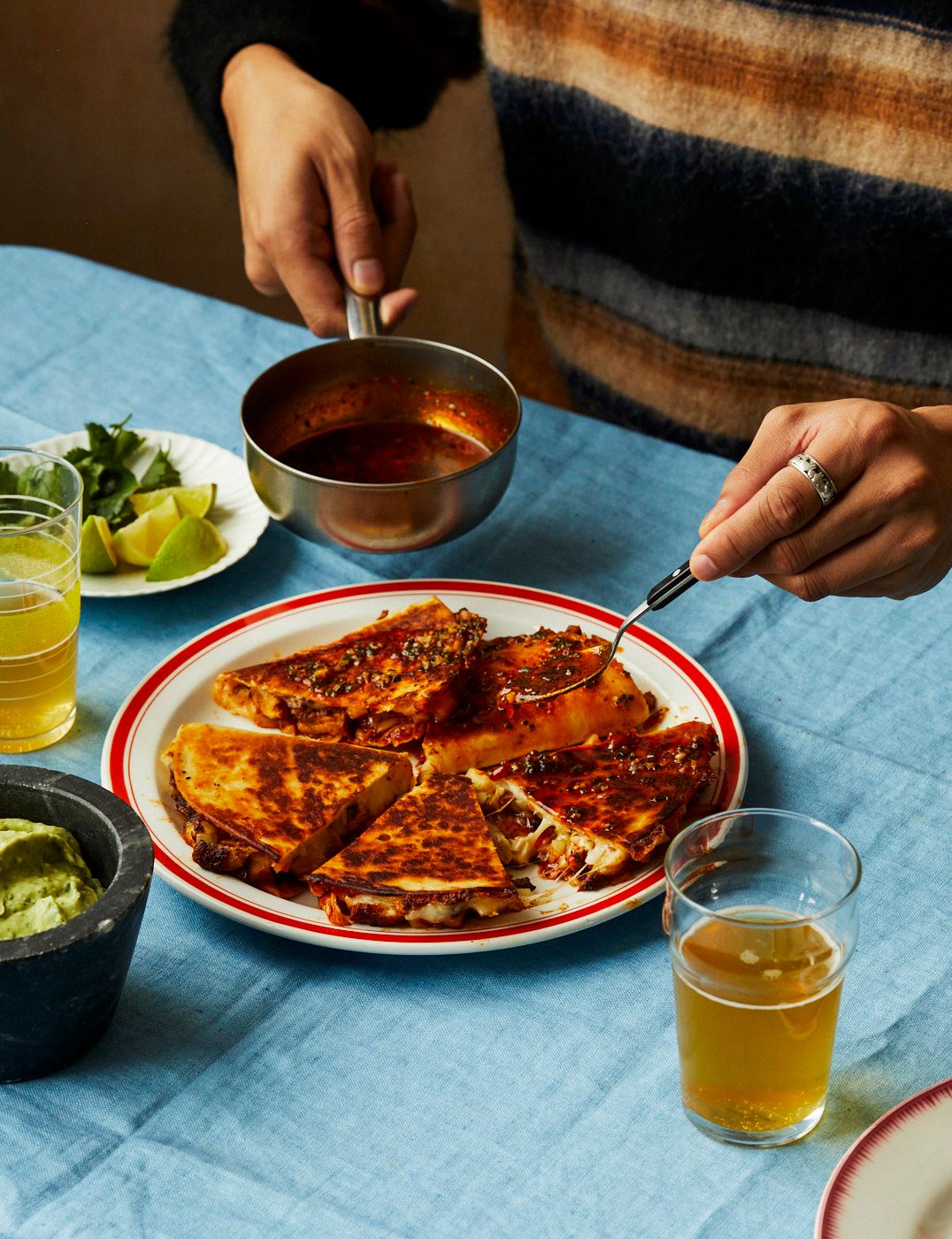 Nothing’s better in a cheesy quesadilla than something spicy and tangy. Enter kimchi! These moreish, chicken-loaded quesadillas are toasted in a pan to crisp up the tortilla then drizzled with chive butter. Fry the chicken thighs whole, then chop them up into tiny pieces, Mexican style.