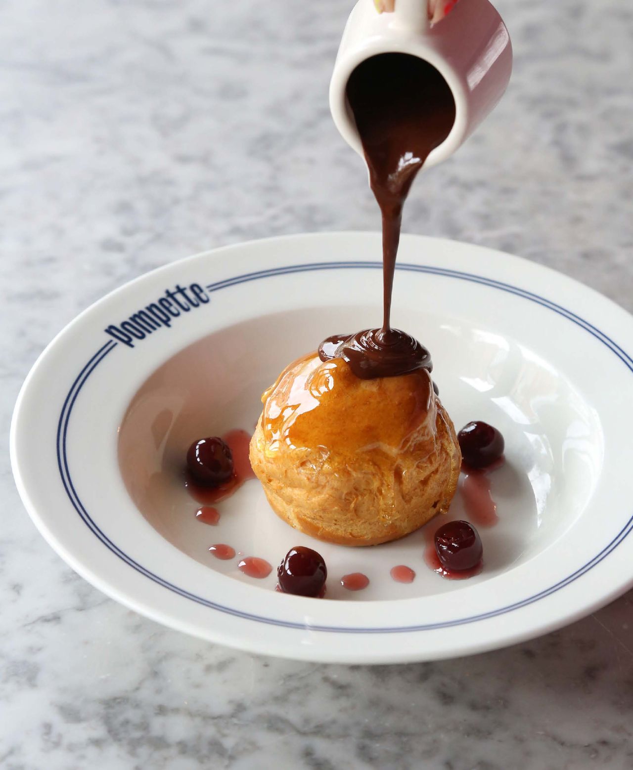 Kirsch choux bun, griottines cherries & warm chocolate sauce